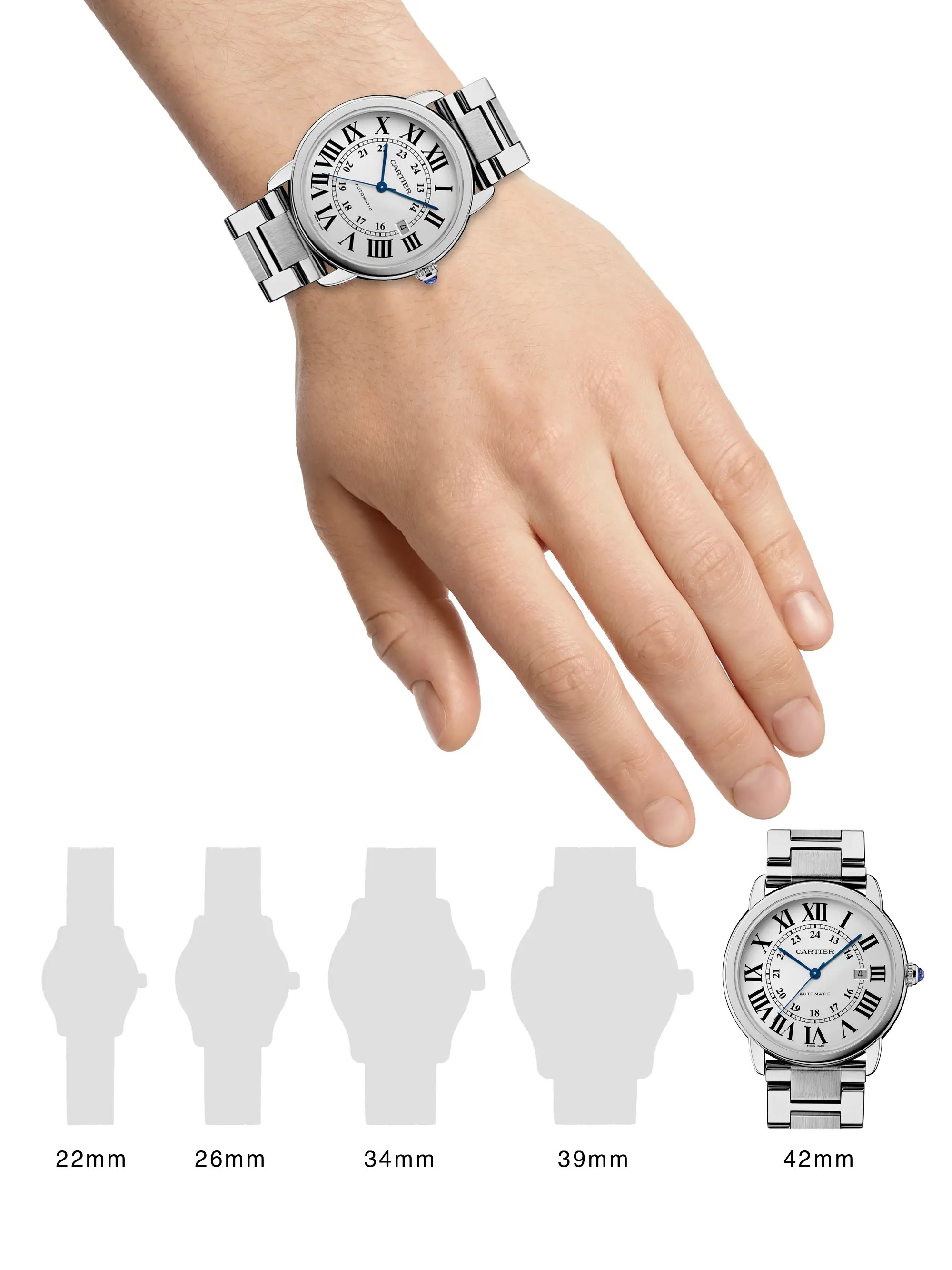 Ronde solo de cartier watch, 42 mm, mechanical movement with automatic winding.. Depending on your style and fit, the 36mm and 42mm steel ronde solo are priced between £2,700 (€3,000 or $3,400) and £3,300 (€3,670 or $4,160). Cartier ronde solo automatic 42mm mens watch.. Add to shopping bag add to bag.
